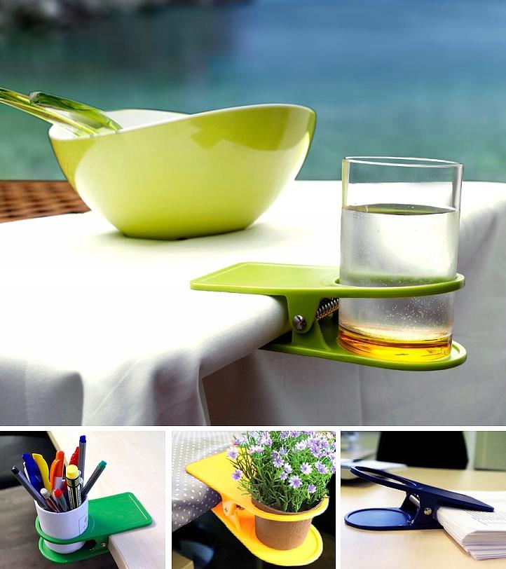 Uchwyt można przypiąć do krawędzi stołu i bezpiecznie wstawić do niego szklankę lub puszkę napoju