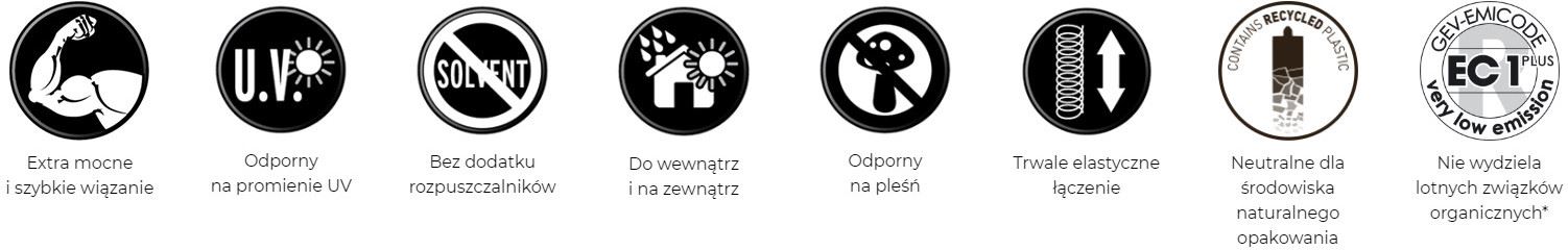 Charakteryzuje się ekstremalną elastycznością spoiny, bardzo wysoką wytrzymałością połączenia i doskonałą przyczepnością do wszelkich podłoży budowlanych - może być aplikowany nawet na wilgotnych powierzchniach