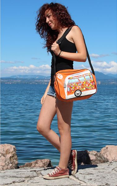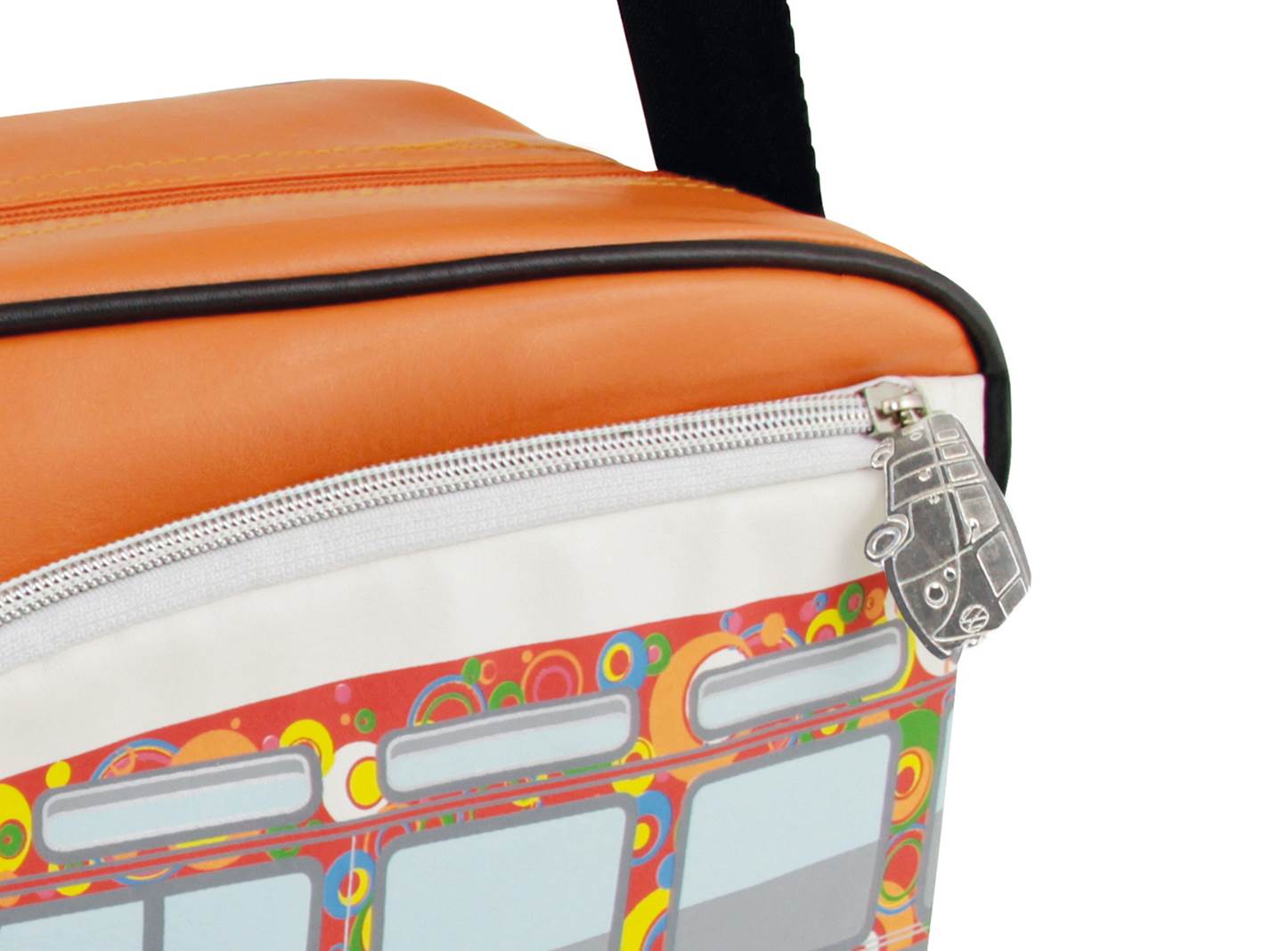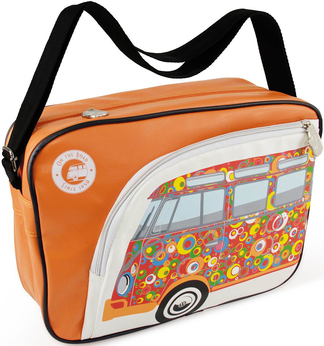 Posiada zewnętrzne kieszenie w postaci przodu Bulli, a także sylwetki busów VW jako zamki błyskawiczne