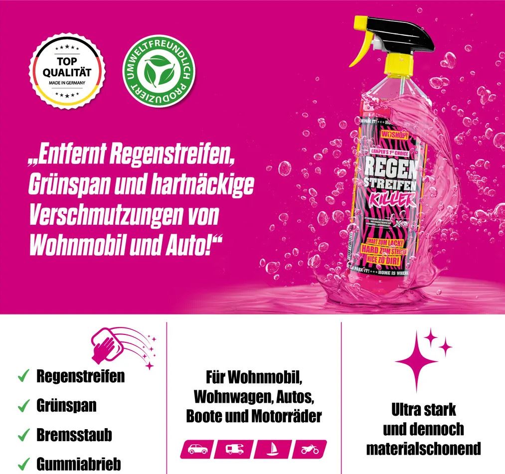 Rain Streak Killer to silny, specjalistyczny środek czyszczący do usuwania uporczywych zabrudzeń, takich jak smugi po deszczu, patyna czy zacieki po uszczelkach