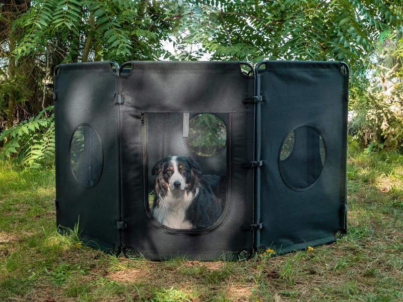 Zapewnia miejsce do zabawy, odpoczynku oraz odseparowuje od innych zwierząt np. na kempingu