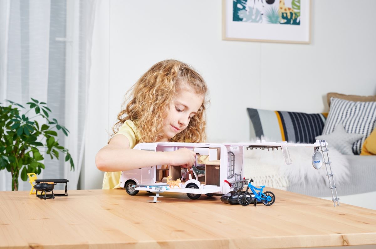 Trenuje motorykę małą – do pojazdu dołączona jest szeroka gama akcesoriów do zabawek: figurka, otwierane drzwi, zestaw stołowy, grill (ze światłem!), deska surfingowa, rower, drabina, box dachowy