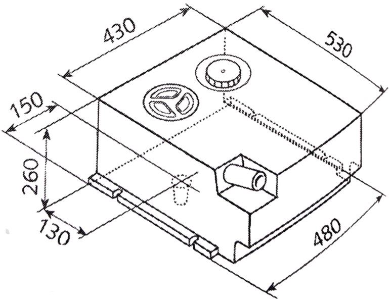 W dolnej części znajduje się króciec spustowy, który przechodzi przez podłogę pojazdu, uszczelniony korkiem z gwintem 1/2" wewnątrz zbiornika